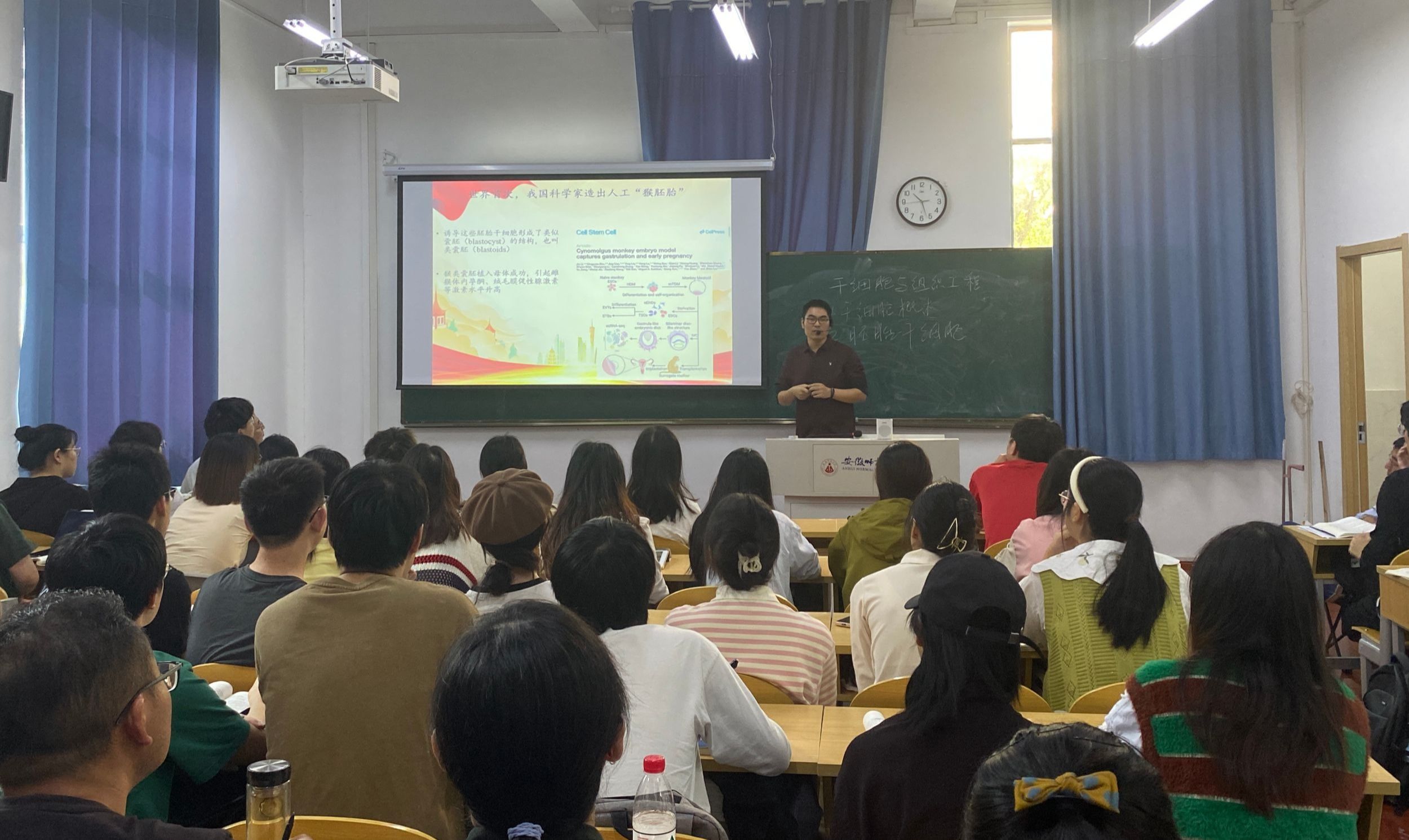本次示范课的内容为“干细胞与组织工程 ”,沈老师首先通过回顾胚胎工程和细胞治疗导入新课,适时引入习近平总书记关于健康中国战略的思想。随后以北大邓宏魁团队完成首例CiPSC诱导的胰岛细胞移植技术用于临床治疗的案例为切入点,突出了干细胞研究的重要性,自然过渡到新内容干细胞的学习。在第一节“干细胞概述”和第二节“胚胎干细胞”授课过程中,沈老师分别介绍了干细胞的生物学特性、干细胞类型、干细胞的增殖特性、干细胞不对称分裂的调控机制、干细胞的分化特征等内容。授课内容适时联系最新的科研论文和技术成果,有机融入健康中国的理念。例如授课过程中,结合了重庆大学团队揭示肿瘤干细胞不对称分裂的新机制、我国科学家世界首次造出人工猴胚胎的新成果。