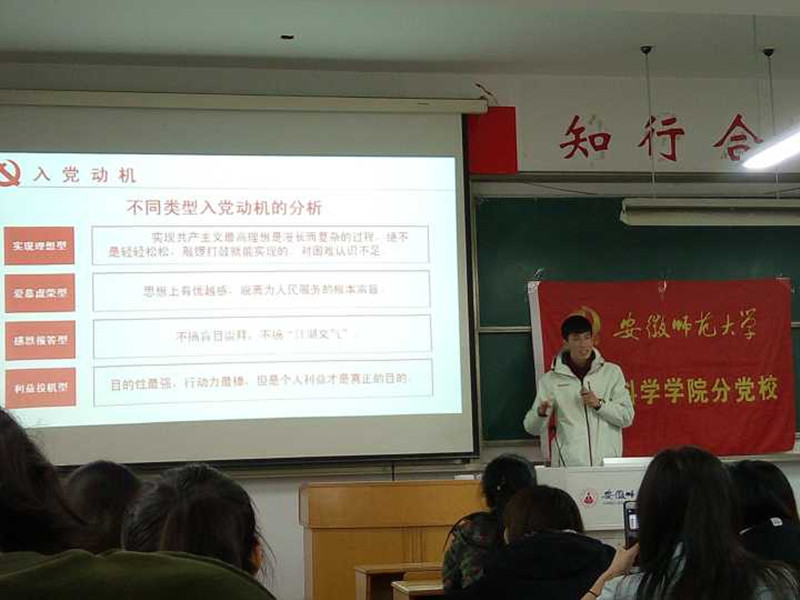 王志以自身入党心路历程开题。他基于先进党员先锋事迹和腐化党员深刻教训等两方面正反经验,指出什么是正确的入党动机,就是将个人目标融入到实现共产主义事业的崇高目标中,用实际行动做贡献、为人民服务。他强调,端正入党动机需要从思想上、学习上、工作上三个方面入手,需要同学主动学习党的方阵路线、理论政策,自觉向党组织靠拢;需要同学们在专业学习上狠下功夫、并引领其他同学积极向上;需要同学们立足社会工作,服务同学、回馈社会。