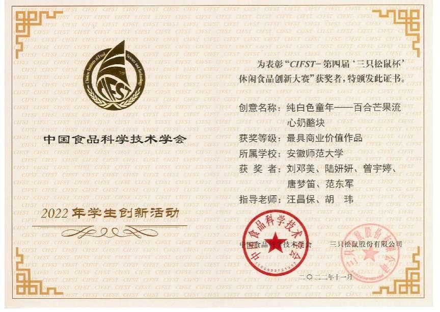 本专业始终坚持工程认证办学标准,坚持以学生为中心,注重培养学生的创新意识、实践操作技能和团队合作精神。推行本科生导师制,重视以赛促学,现已形成有梯度、有层次的训练和参赛机制,连续多年教师指导学生在全国“互联网+”大学生创新创业大赛、中国食品科学技术学会(CIFST)- “三只松鼠杯”休闲食品创新大赛、全国大学生功能食品与葡萄酒创新设计大赛、安徽省大学生食品设计创新大赛、“挑战杯”安徽省大学生创业计划竞赛、安徽省大学生生命科学竞赛、食品专利大赛等各种学科竞赛中斩获佳绩。近五年,食品专业学生获得国家级和省级以上各类奖项50余项。