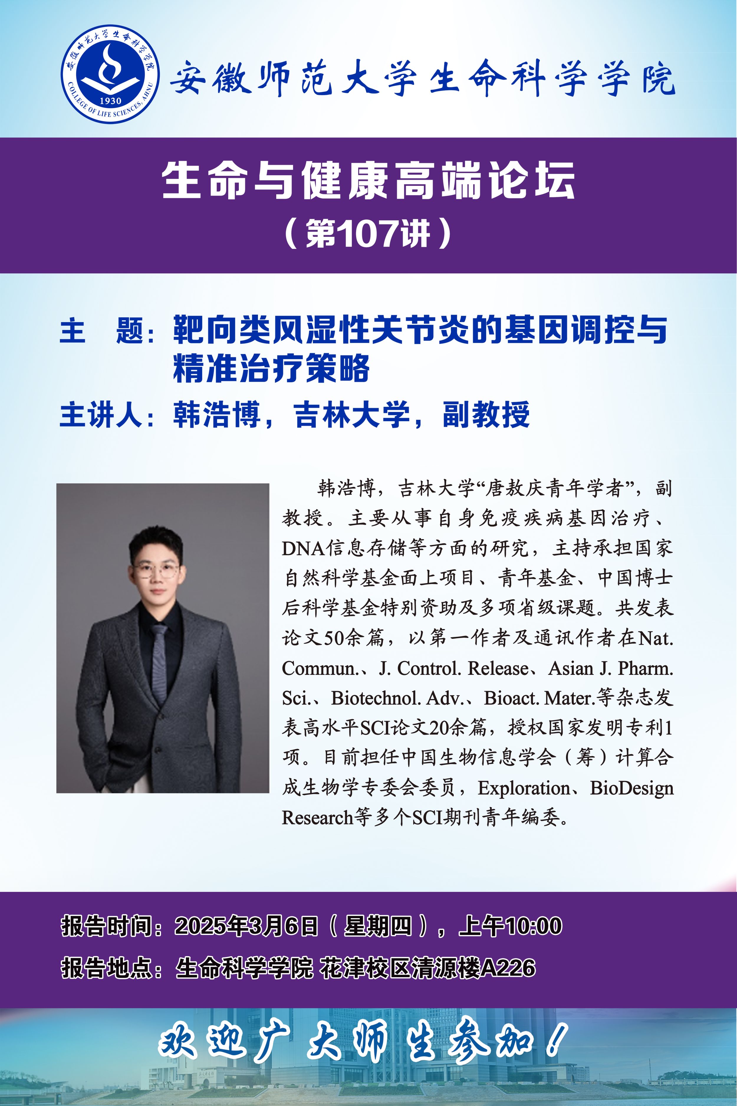 【学术预告】生命与健康高端论坛第107讲:靶向类风湿性关节炎的基因调控与精准治疗策略