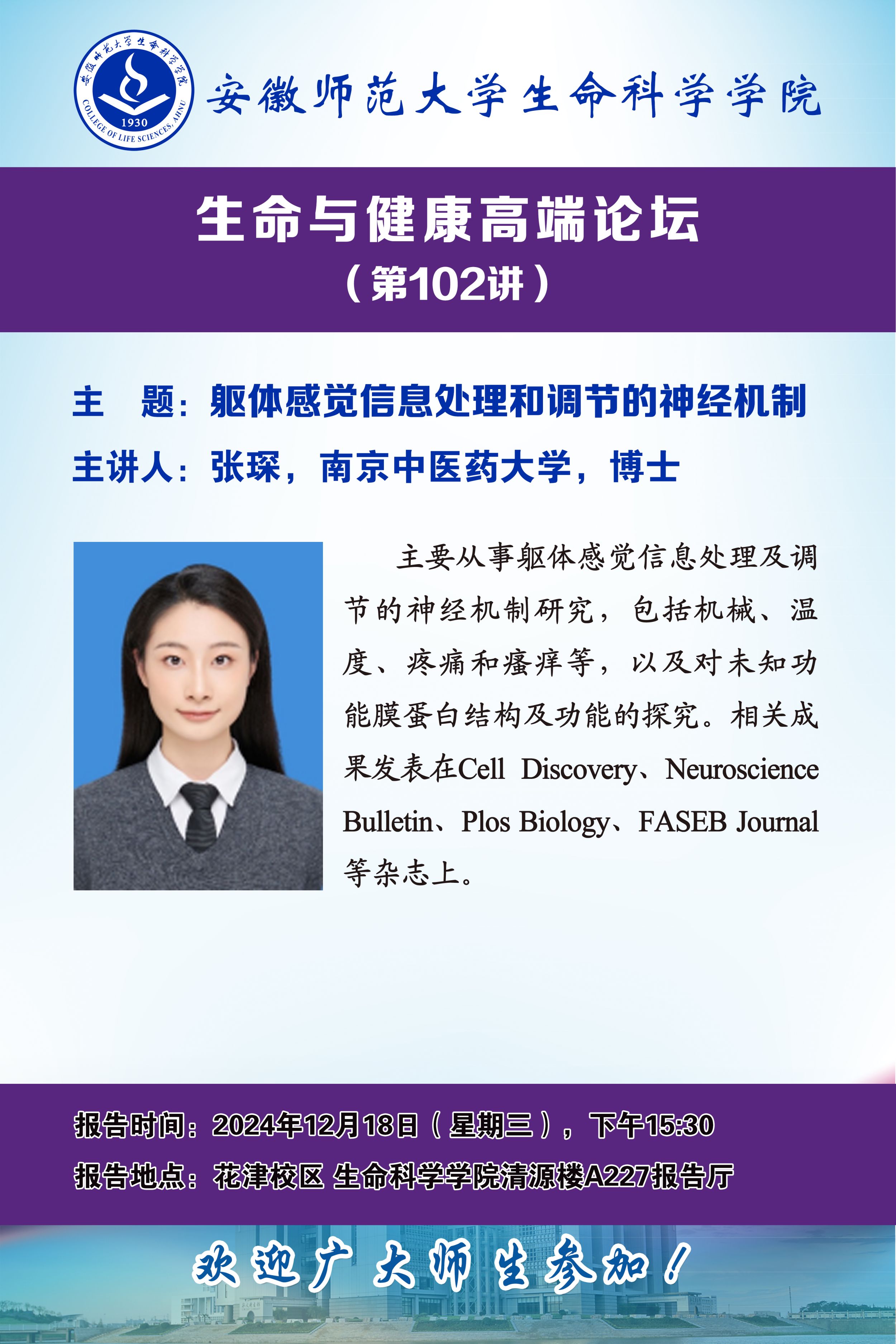 【学术预告】生命与健康高端论坛第102讲:躯体感觉信息处理和调节的神经机制