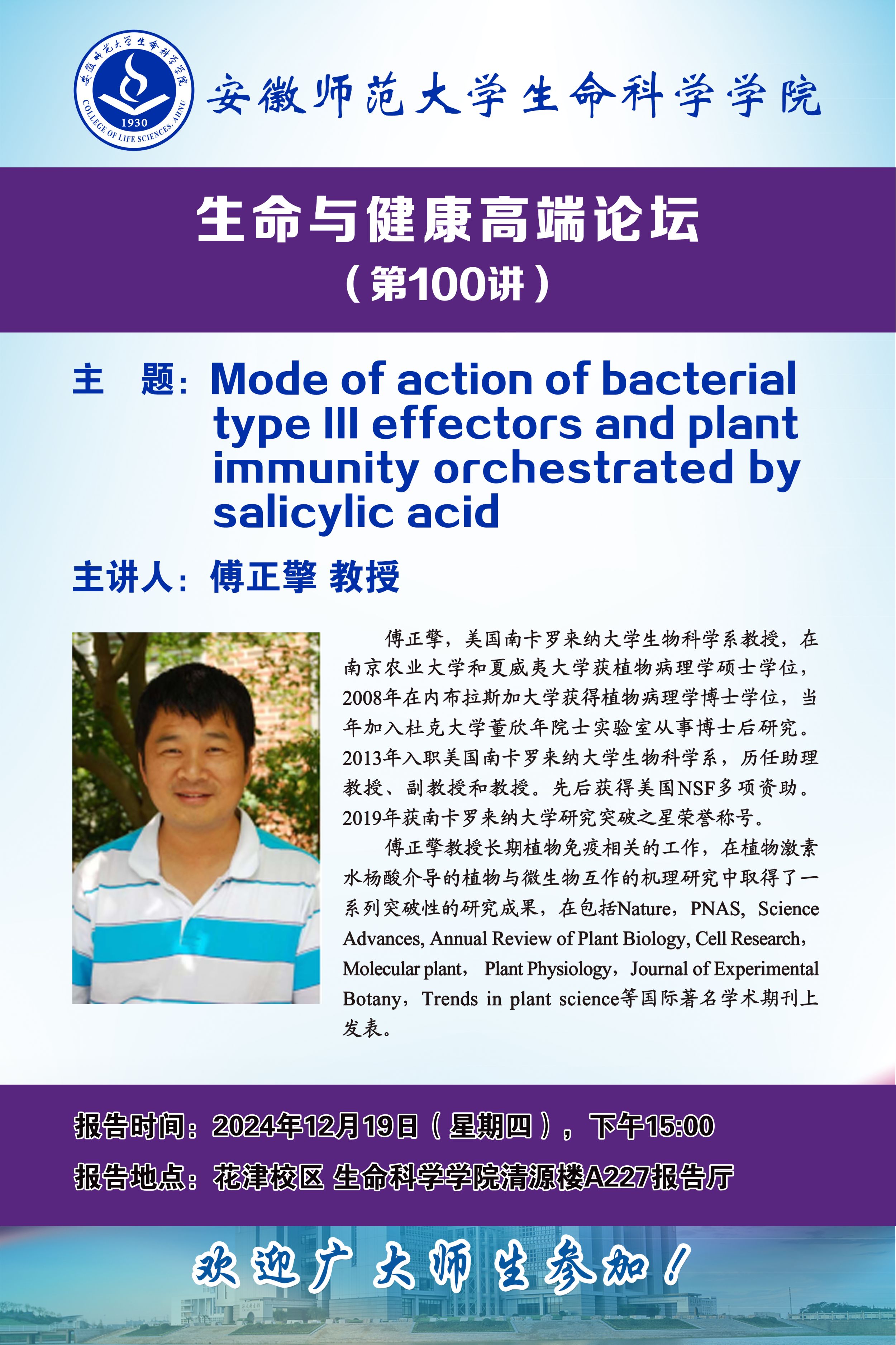 【学术预告】生命与健康高端论坛第100讲:Mode of action of bacterial type III effectors and plant immunity orchestrated by salicylic acid