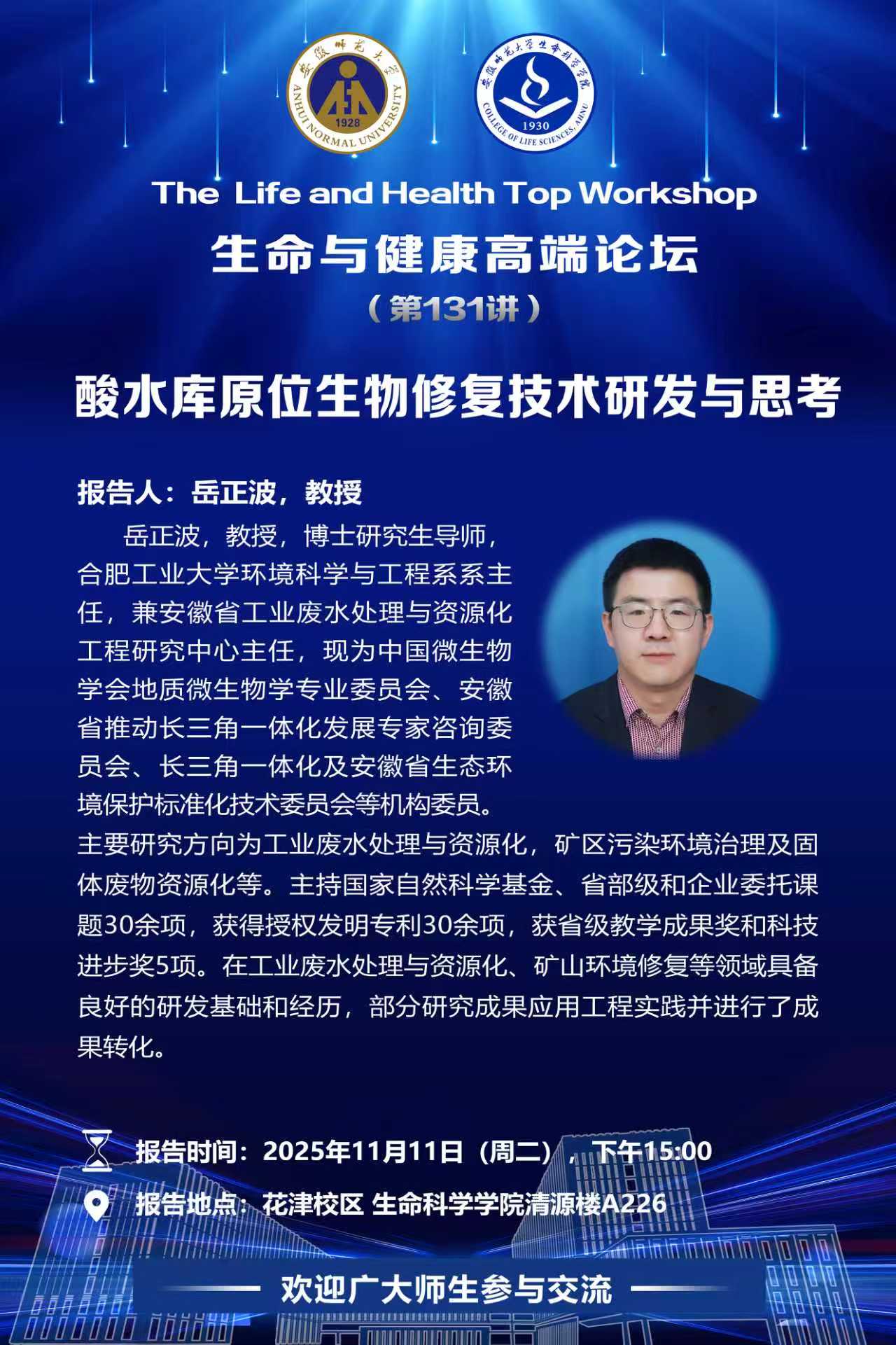 【学术预告】生命与健康高端论坛第131讲:酸水库原位生物修复技术研发与思考